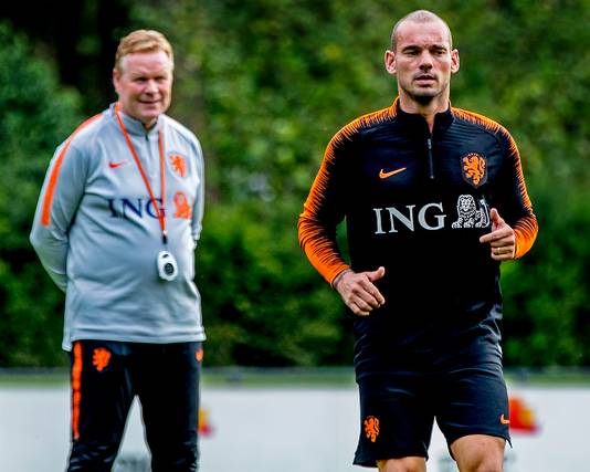 De spelers van het nederlands elftal dragen de trainingspakken op de training en onderweg naar de wedstrijden.